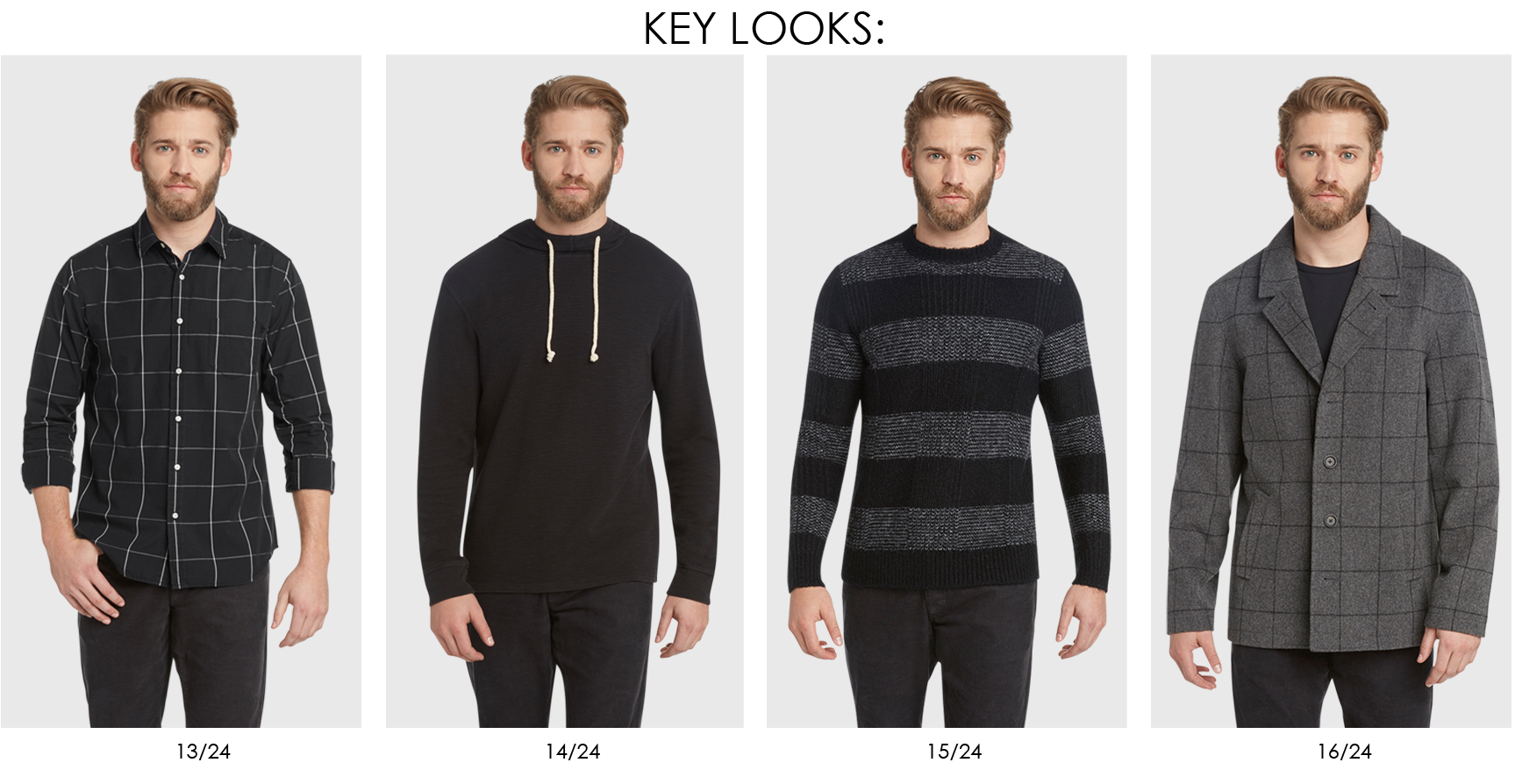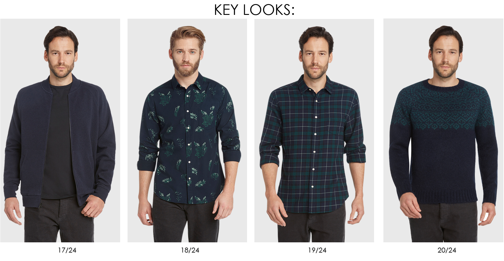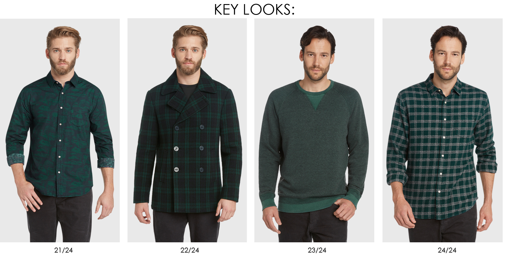 Traditional Scottish history, heritage fabrics and English craftsmanship inspire a return to the roots of quintessential menswear. Checks, tartans and houndstooth flannels are paired with corduroy shirt jackets, classic blazers, traditional wool pea coat, cropped trousers and athletic inspired jackets. Knitwear pays homage to English craft and Scottish heritage by reworking classic twill and herringbones through pattern and texture, as well as fair isles, toile jacquards and Harrington inspired wool bombers.