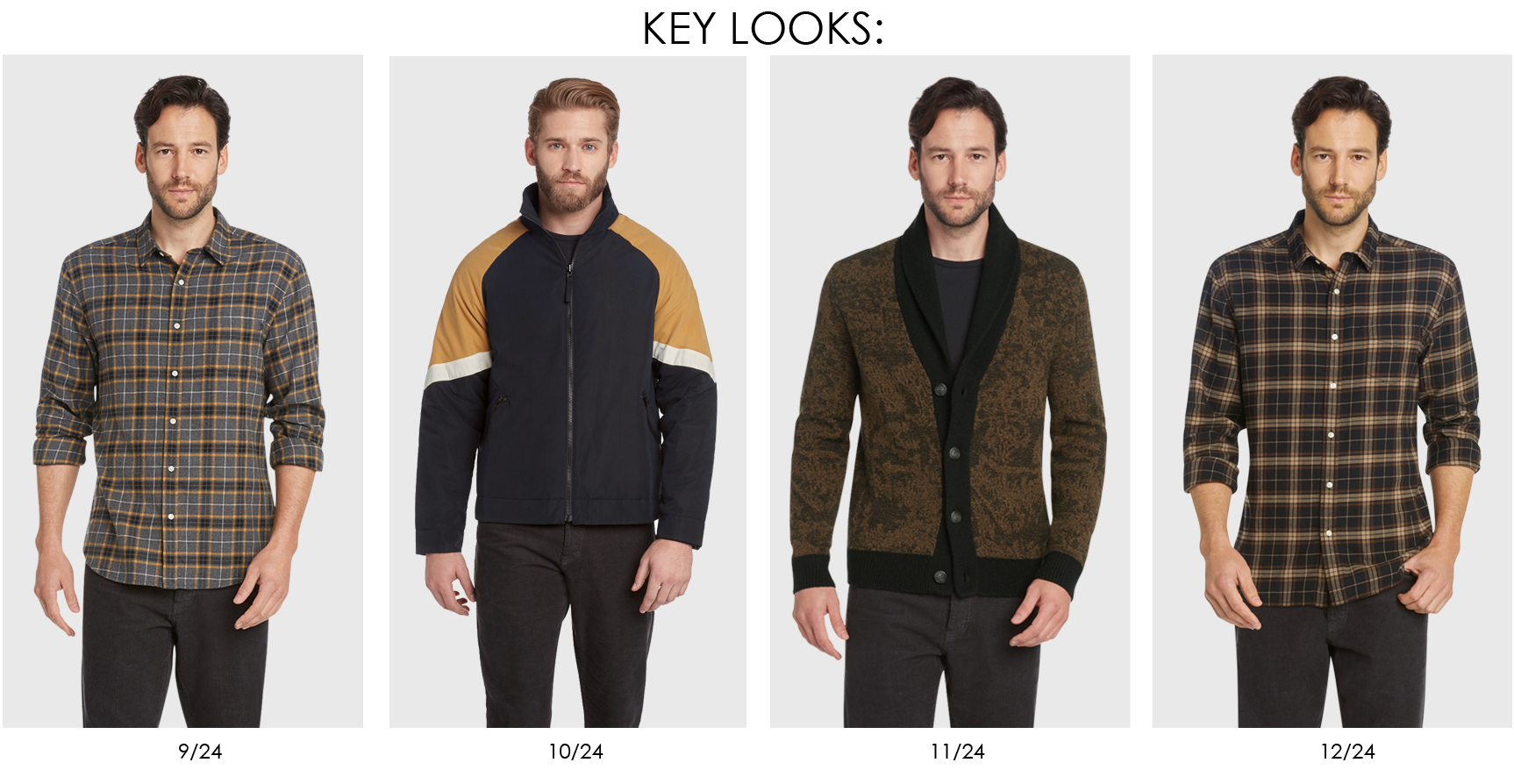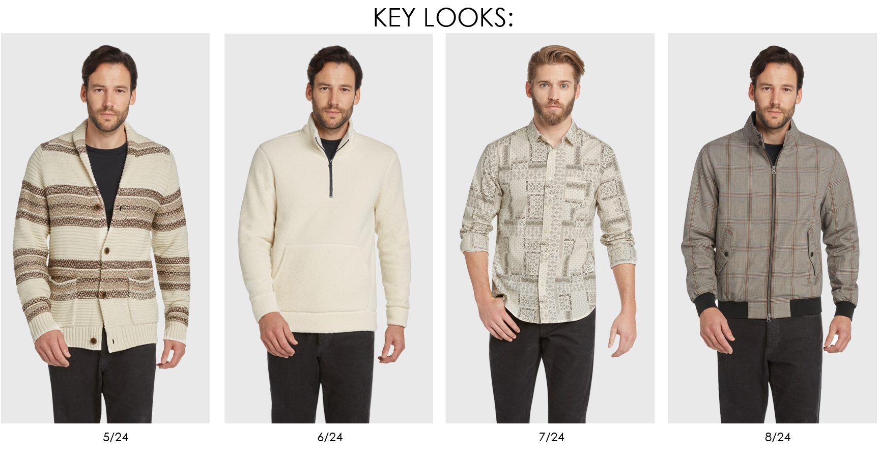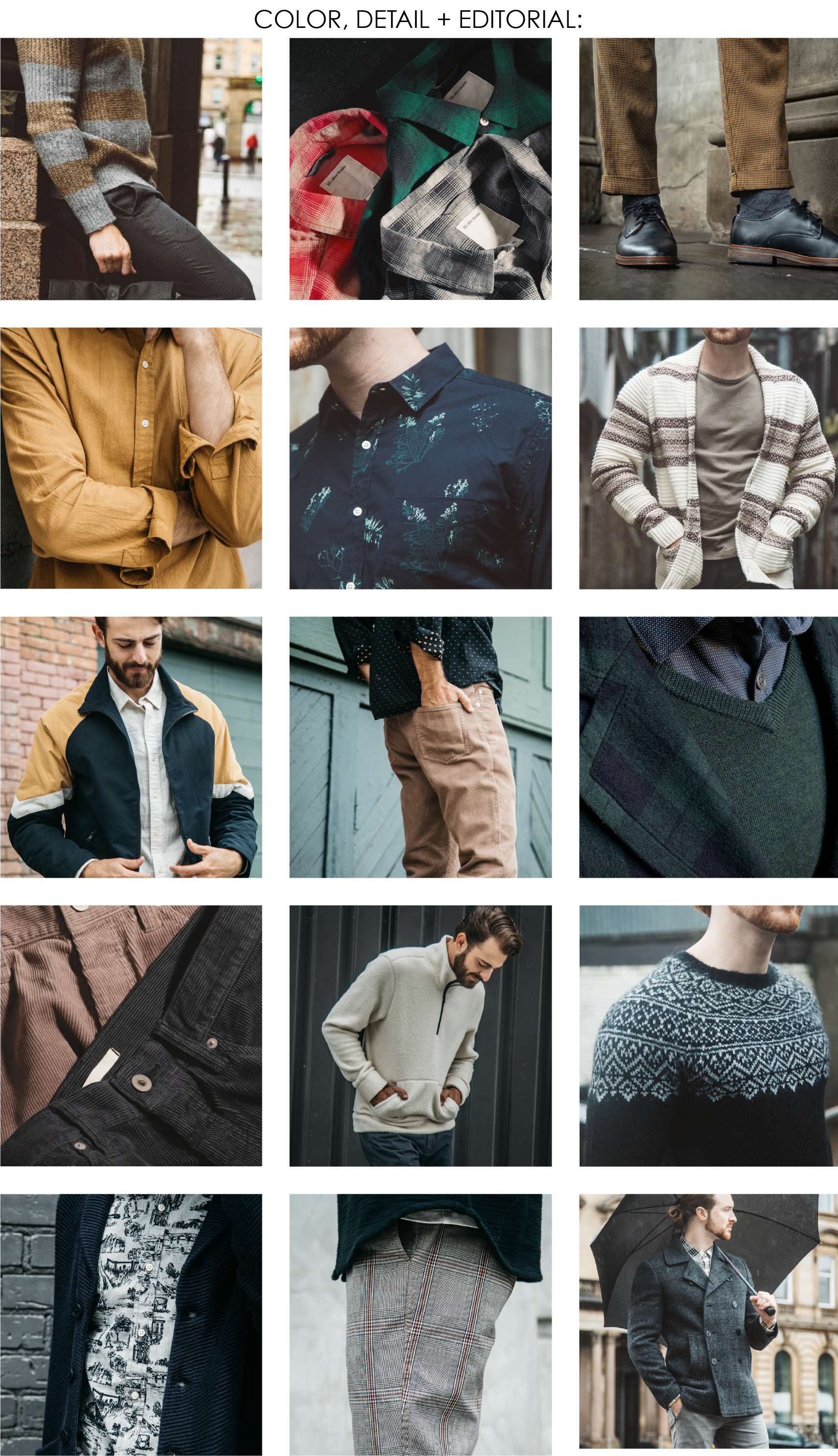 Traditional Scottish history, heritage fabrics and English craftsmanship inspire a return to the roots of quintessential menswear. Checks, tartans and houndstooth flannels are paired with corduroy shirt jackets, classic blazers, traditional wool pea coat, cropped trousers and athletic inspired jackets. Knitwear pays homage to English craft and Scottish heritage by reworking classic twill and herringbones through pattern and texture, as well as fair isles, toile jacquards and Harrington inspired wool bombers.