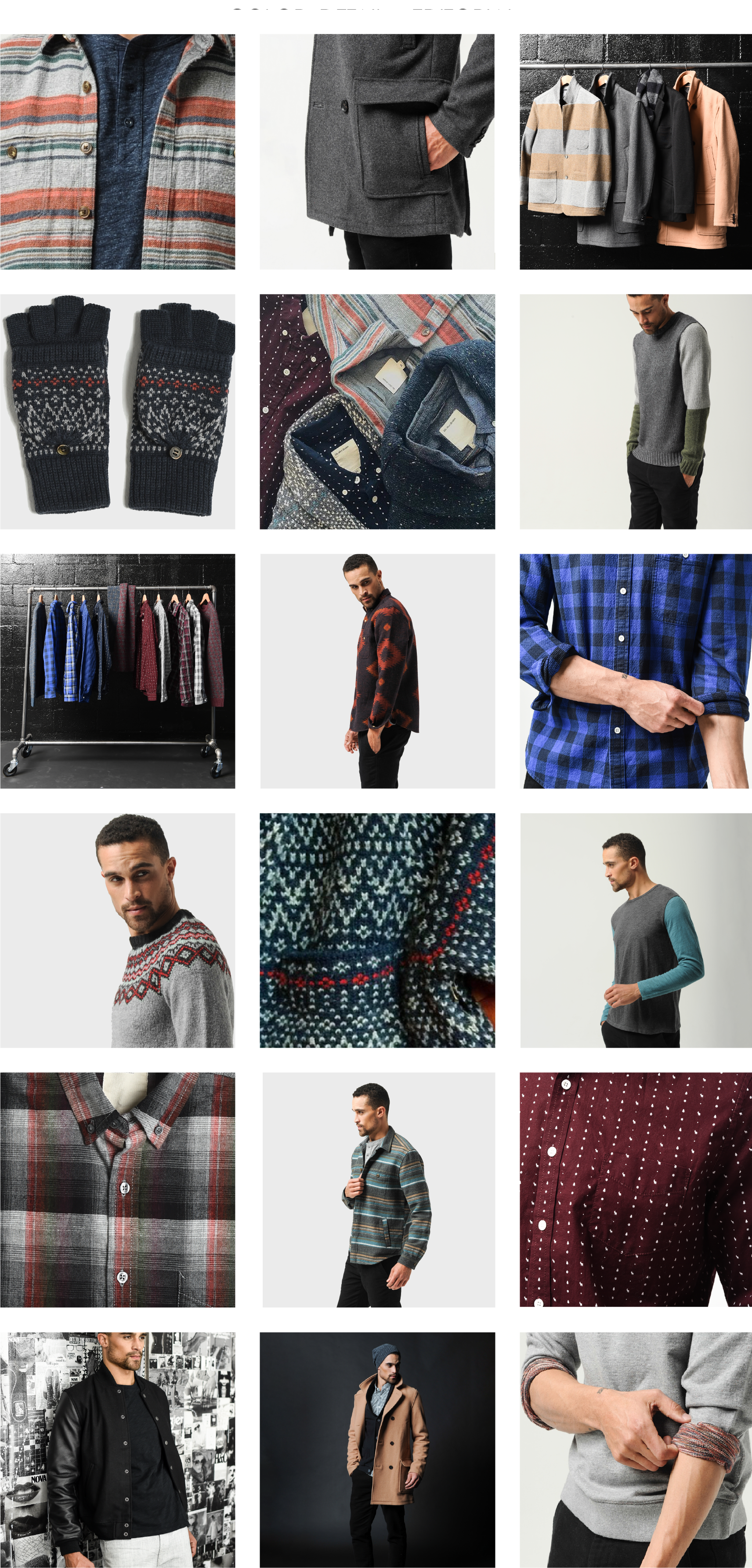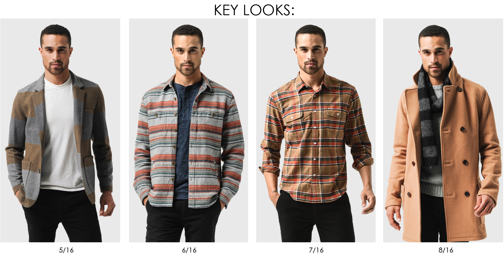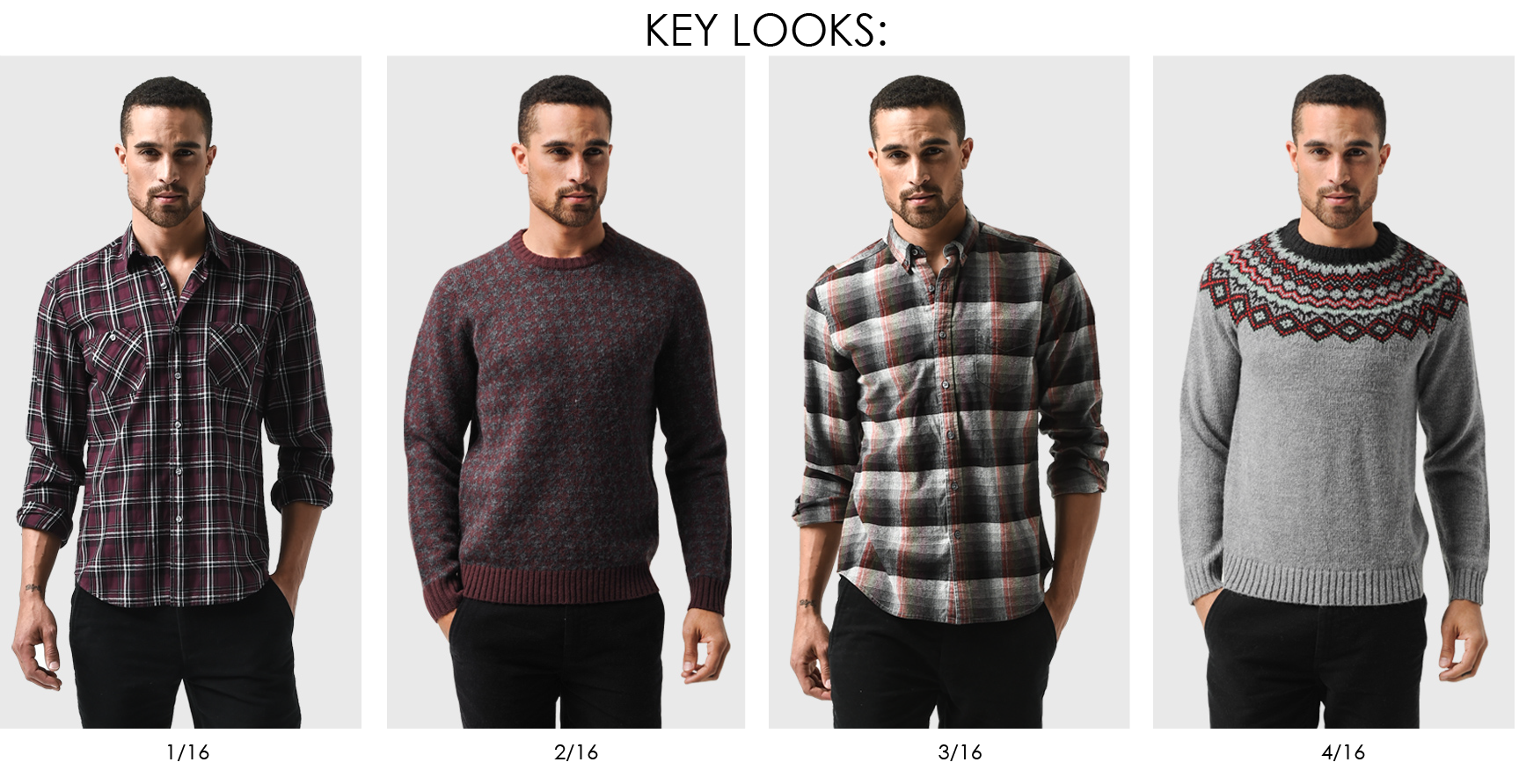 An homage to Native American culture with a rock 'n roll spirit. Classic styles are updated with pattern and texture through jacquards, double weaves with and tactile dobbys. Rustic flannels, tweed hunting jackets and blanket stripes are paired opposite bold checks, ski crews, leather varsity jackets and wool outerwear creating a trifecta of folksy edgy and polished.
