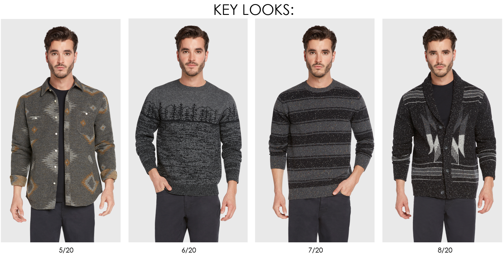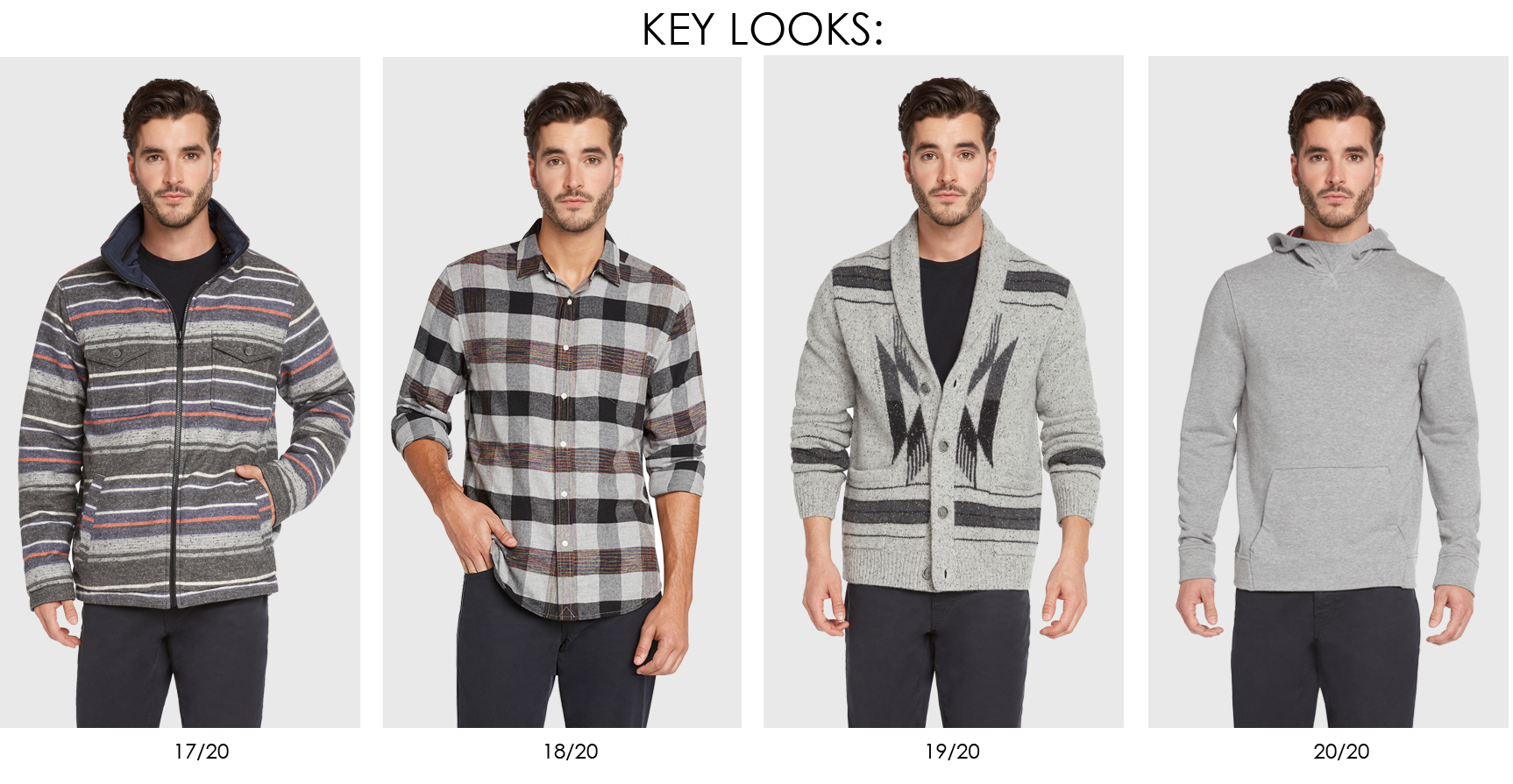 This season brings a contemporary perspective on an age old phenomenon. Folklore and the kaleidoscope of the Aurora Borealis inspire a colorful pattern driven assortment. Constellation prints and neppy yarns call upon the night sky, ombre cable crews mimic the Northern lights and landscape motifs adorn sweaters. Sherpa trim, striped flannels and tribal patterns draw reference to handcrafted blankets and translate into compact weaves, jacket linings and jacquard cardigans. Garment dyed knits and sweaters offer a lived in, well traveled look alongside double layer flannels, tee pee dobby patterns and native cave prints.