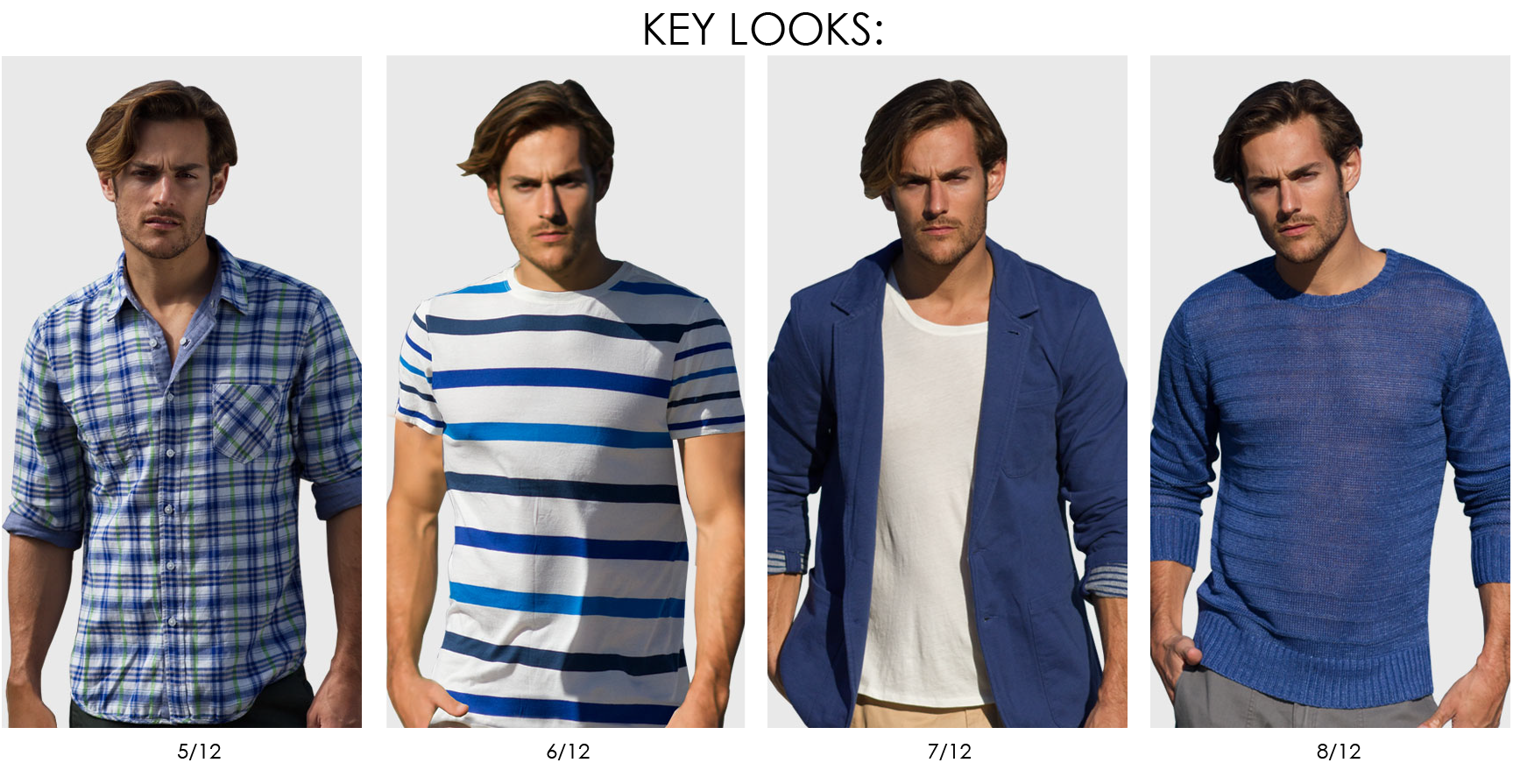 Boardwalk attire with a boho spirit. Nautical staples are reinterpreted with eclectic charm. Relaxed silhouettes and lightweight fabrics mix with bold patterns and bright colors which include washed out chambrays, garment dyed linen, yarn dyed checks, dobby stripes, ethnic jacquards and ikat inspired madras plaids. Blazers are unstructured and cut from crinkle cloth while matching shorts come belted in brightly woven patterns. Knitwear includes French Terry blazers, color blocked tees and classic bretons updated in ombre stripes while sweaters are light and knit from hemp and linen slub blends.